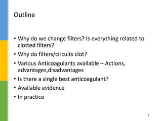 This document discusses anticoagulation for continuous renal replacement therapy (CRRT). It begins by outlining factors that can lead to clotting of CRRT filters and circuits. The main anticoagulation modalities discussed are heparin, low molecular weight heparin, citrate, and no anticoagulation. For each option, the mechanisms of action, advantages, disadvantages, dosing protocols, and typical filter life spans are summarized. Regional citrate anticoagulation is highlighted as it avoids systemic anticoagulation effects while effectively preventing clotting. Details are provided on citrate metabolism and calcium replacement to maintain safe ionized calcium levels.