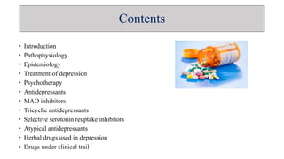 Major depression is a mood disorder characterized by depressed mood or loss of interest in activities. It is estimated that over 300 million people worldwide suffer from depression. Treatment involves psychotherapy such as cognitive behavioral therapy and antidepressant medication. There are several classes of antidepressants including selective serotonin reuptake inhibitors (SSRIs), tricyclic antidepressants, and atypical antidepressants. SSRIs are now the first-line treatment due to their favorable side effect profile compared to other antidepressants. Research is also being conducted to develop new antidepressant drugs with novel mechanisms of action.