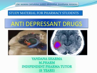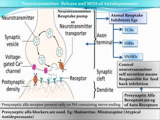 The document discusses antidepressant drugs, their mechanism of action, classifications, and the various types of depression they address. It explores neurotransmitter involvement, particularly norepinephrine and serotonin, detailing the role of tricyclic antidepressants (TCAs) and monoamine oxidase inhibitors (MAOIs) in treatment, along with potential side effects and drug interactions. Additionally, it emphasizes the importance of monitoring for suicidal ideation in young adults when using these medications.