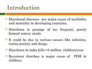 Diarrhea is a major cause of morbidity and mortality in developing countries. The mainstay of treatment is to correct fluid and electrolyte imbalance through oral rehydration therapy or IV fluids. Specific treatment depends on the cause and includes antimicrobial agents for infectious diarrhea and anti-motility drugs for non-infectious diarrhea. Anti-motility drugs like loperamide work by increasing intestinal transit time through mu and delta opioid receptors while anticholinergics decrease bowel motility and secretion. Antimicrobials are useful for specific infections while anti-inflammatory drugs are used for conditions like ulcerative colitis.
