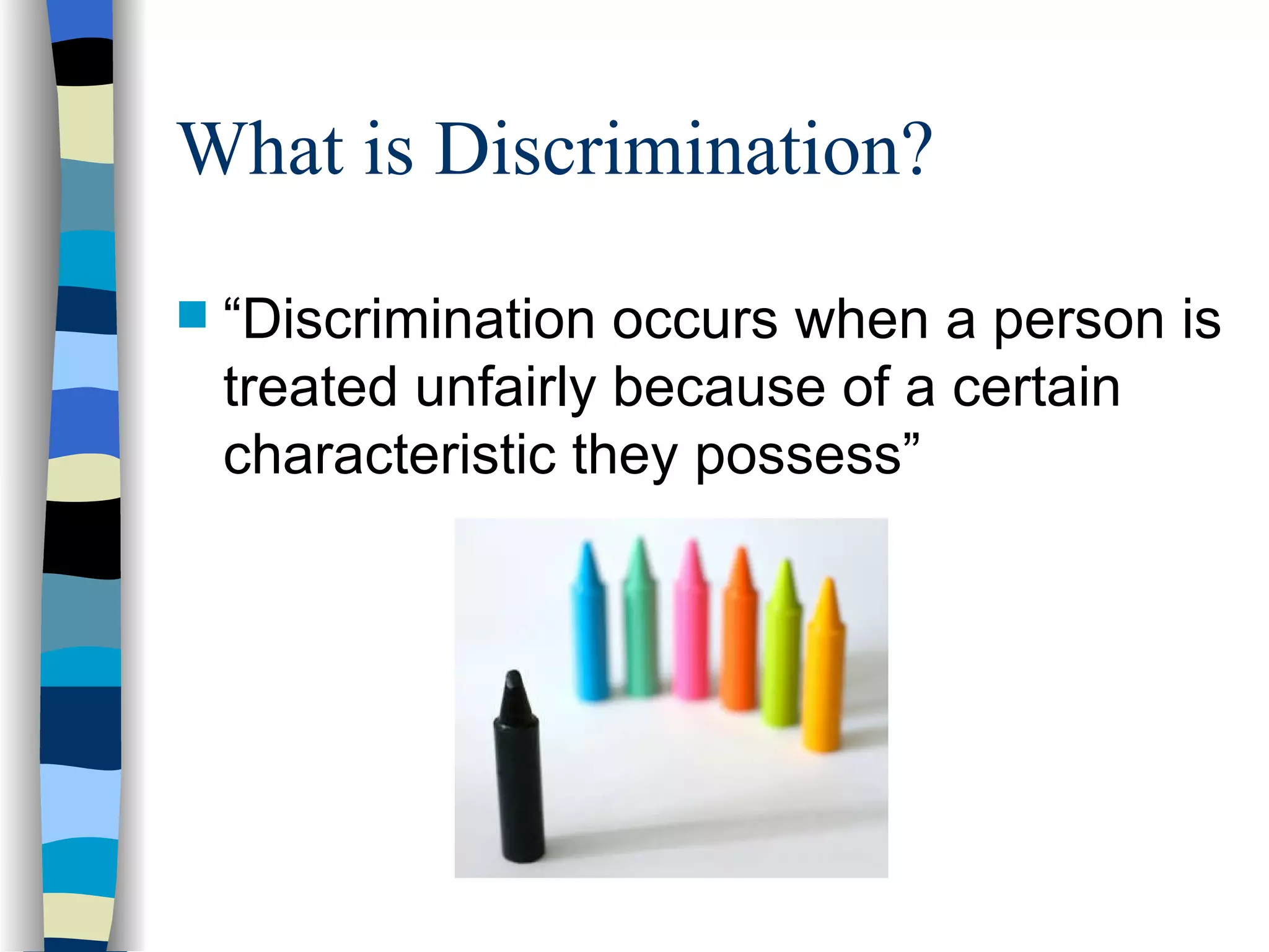 Discrimination in the workplace occurs when people are treated unfairly due to characteristics like their race, gender, age, religion or disability. Examples include hiring someone of one ethnic background over another, not interviewing someone with a foreign name, or paying men higher wages than women for the same job. Australian laws like the Racial Discrimination Act and Sex Discrimination Act aim to prevent such discrimination and ensure equal opportunity and treatment in employment regardless of personal attributes.