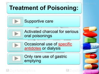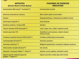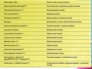 The document discusses antidotes for poisoning treatment. It defines an antidote as a therapeutic substance used to counteract the toxic effects of a xenobiotic. Antidotes are classified according to their mode or site of action, and include physical, chemical, and pharmacological antidotes. Physical antidotes like activated charcoal work by adsorption. Chemical antidotes form non-toxic complexes with toxins or accelerate detoxification. Pharmacological antidotes counteract toxins by antagonism at receptor sites, blocking toxic effects, or aiding normal function restoration. The proper use of antidotes combined with supportive care can significantly reduce morbidity and mortality from poisonings.
