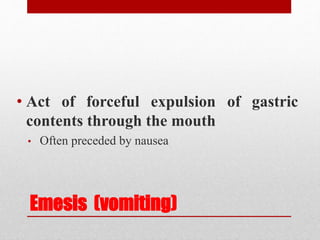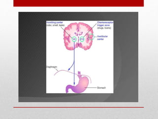 This document discusses emetics, which induce vomiting, and antiemetics, which prevent vomiting. It describes the physiology of vomiting including the vomiting center and chemoreceptor trigger zone in the brain. It explains the mechanisms and sites of action of various classes of antiemetic drugs including antihistamines, 5-HT3 receptor antagonists, dopamine antagonists, cannabinoids, glucocorticoids, and others. It provides details on specific antiemetic drugs like metoclopramide, ondansetron, dexamethasone, and their indications, mechanisms, pharmacokinetics and adverse effects.