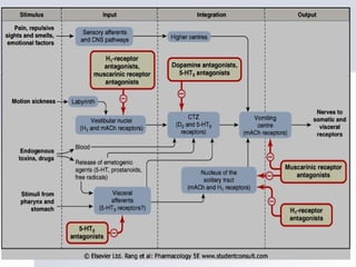 This document discusses antiemetics, which are drugs used to treat nausea and vomiting. It begins by outlining the learning objectives, which are to classify antiemetic drug classes based on mechanism of action, understand pharmacokinetics and dynamics of classes, identify drugs for specific causes, learn adjuvant antiemetics, and describe side effects. It then discusses the physiology of vomiting and consequences. Causes of nausea and vomiting are organized using the acronym VOMIT. The receptors and pathways involved are explained. The main classes of antiemetics are then described in more detail based on their receptor targets and indications. Specific drugs, dosages, advantages and side effects within each class are compared. Lastly, guidelines