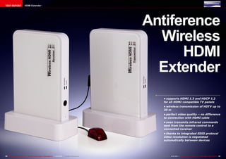 1. The document tests the Antiference Wireless HDMI Extender, which can transmit HDMI signals up to 30 meters wirelessly.