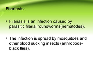 1) Filariasis is caused by parasitic roundworms transmitted through mosquito bites. It affects lymphatic vessels and can cause elephantiasis.