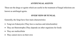 This document provides information on various antifungal agents including their mechanisms of action, uses, and common side effects. It discusses several major classes of antifungals such as azoles (imidazoles, triazoles), polyenes (nystatin, amphotericin B), allylamines (tolnaftate, terbinafine), and echinocandins (caspofungin). It also summarizes the mechanisms, structures, and structure-activity relationships of individual antifungal drugs like fluconazole, itraconazole, clotrimazole, and flucytosine.