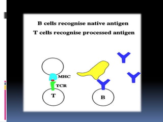 The document discusses various properties of antigens that determine their antigenicity including molecular size, foreignness, chemical complexity, stability, and more. It also describes different types of antigenic determinants recognized by B cells and T cells as well as factors like dosage, route of administration, and adjuvants that influence immunogenicity. Finally, it covers antigen specificity and different types of antigens such as haptens, superantigens, and isoantigens.