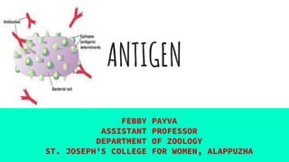 The document defines key terms related to antigens and the immune system. It states that antigens are substances that can induce an immune response and are recognized by B cells, T cells, or antibodies. Antigens contain antigenic determinants or epitopes, which are the specific parts of an antigen recognized by the immune system. Epitopes can be conformational, involving the antigen's 3D structure, or linear, involving a continuous amino acid sequence. For an antigen to be immunogenic, it must be large in size, foreign to the host, and multivalent with multiple epitopes. Small molecules called haptens are not immunogenic on their own but can become so when attached to a carrier protein.