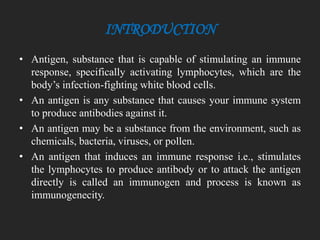 2. There are different types of antigens including exogenous antigens from outside the body, endogenous antigens produced internally, autoantigens that cause autoimmune disorders, and tumor antigens on cancer cells.