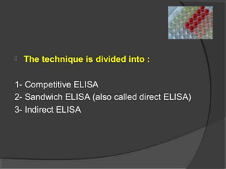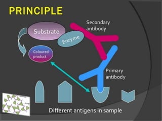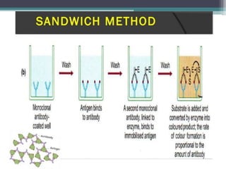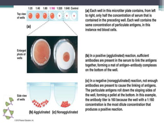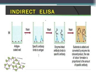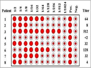 The document outlines various antigen-antibody interactions and their significance in immunoassays. It discusses several techniques, including the complement fixation test, ELISA, immunofluorescence, and agglutination tests, detailing how they work and their applications. Different types of immunofluorescence methods and agglutination reactions, including qualitative and quantitative tests, along with concepts like the prozone effect and hemagglutination inhibition, are also explored.