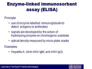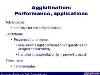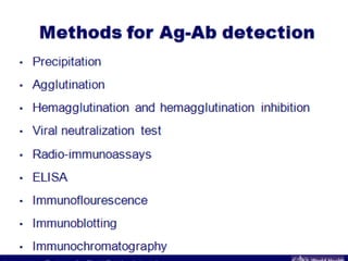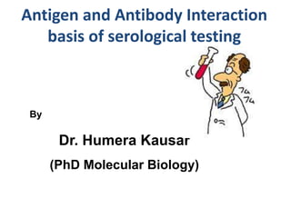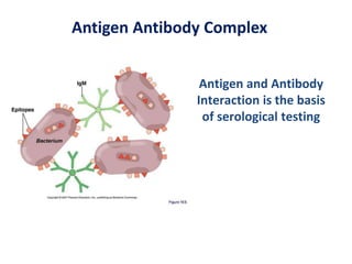 Antigen and antibody interaction is the basis of serological testing. There are several types of serological tests that detect this interaction, including precipitation, agglutination, hemagglutination, enzyme-linked immunosorbent assay (ELISA), Western blot, hemagglutination inhibition, and immunofluorescence. These tests exploit the formation of antigen-antibody complexes to diagnose diseases, identify pathogens, and detect proteins.
