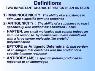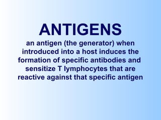 Antigens are substances that induce an immune response when introduced to a host. They have two key characteristics - immunogenicity, which is the ability to stimulate an immune response, and antigenicity, which is the ability to react with antibodies or sensitized T cells. Antigens can be classified as foreign, auto, iso, or hetero antigens depending on their source. Important antigen types include haptens, epitopes, and superantigens. The immune system responds to antigens through antibodies and T cell activation.