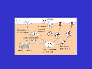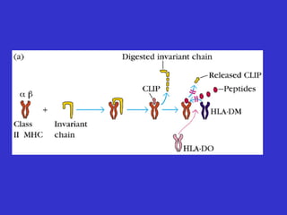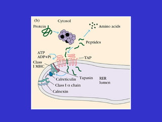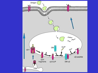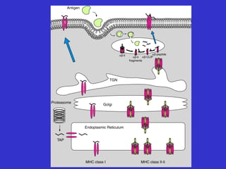 Antigen processing and presentation involves two pathways: 1) Exogenous antigens are internalized, processed in the endosome, and presented on MHC class II to CD4+ T cells. 2) Endogenous antigens are processed by the proteasome in the cytosol, transported to the ER by TAP, loaded onto MHC class I, and presented to CD8+ T cells. For an immune response, antigen must be degraded into peptides and bound to MHC molecules on antigen presenting cells to activate T cells through TCR recognition and co-stimulation.