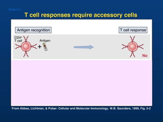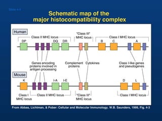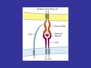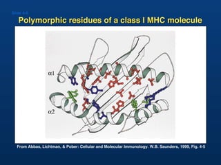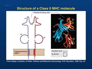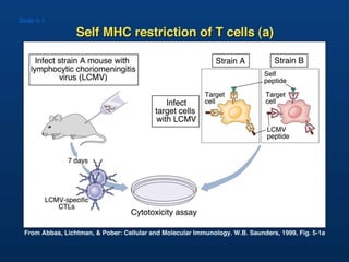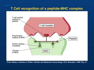 T lymphocytes recognize short peptide fragments of proteins bound to major histocompatibility complex (MHC) molecules on the surface of antigen-presenting cells. There are two classes of MHC molecules - MHC class I presents peptides to CD8+ T cells on all nucleated cells, while MHC class II presents peptides to CD4+ T cells on professional antigen-presenting cells. Peptides bind to MHC molecules through anchor residues in a specific sequence motif, and a single MHC molecule can bind many different peptides. MHC molecules are highly polymorphic, which limits T cell recognition to peptides bound to self MHC molecules only.