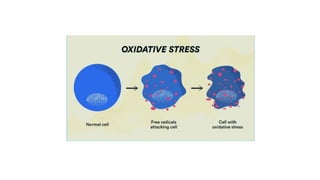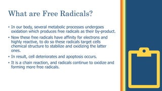 This document discusses various assays used to measure antioxidant activity. It begins by explaining that free radicals are produced during metabolic processes and can damage cells, but antioxidants terminate these reactions. Common antioxidants include vitamins C and E. Assays are used to quantitatively measure antioxidant potential and are based on hydrogen atom transfer (HAT) or electron transfer (ET) reactions. Examples of specific assays described include DPPH, ABTS, FRAP, catalase, and superoxide dismutase assays. Procedures for each assay are provided. The document emphasizes the importance of safety during experimental procedures.