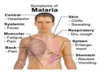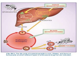 This document discusses antimalarial drugs. It begins by introducing malaria and its causative parasites. It then describes the life cycle of the malaria parasite, involving stages in both the human host and mosquito vector. The objectives and classifications of antimalarial drugs are outlined. Key drugs like chloroquine, primaquine, quinine, and artemisinins are then described in detail, including their mechanisms of action, uses, and adverse effects. Combination therapies using artemisinins are emphasized as the most effective strategy to prevent drug resistance from emerging.
