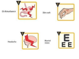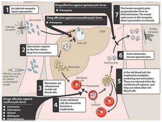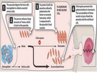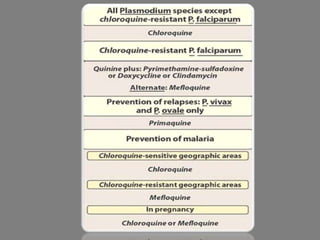 The document discusses various antimalarial drugs, classifying them as tissue schizontocides or blood schizontocides. It summarizes the mechanisms of action, pharmacokinetics, uses, and side effects of several common antimalarial medications including chloroquine, primaquine, mefloquine, quinine, pyrimethamine, tetracyclines, and artemisinin derivatives. It also describes various artemisinin-based combination therapies that are now widely used as first-line treatments for Plasmodium falciparum malaria.