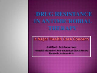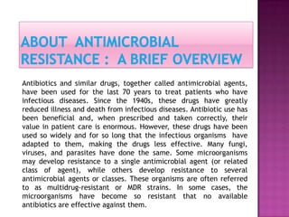 Antimicrobial resistance is a growing health concern as many disease-causing bacteria, viruses, fungi and parasites have developed resistance to existing drugs used to treat infections. Microbes develop resistance through natural evolution and selection pressures from overuse and misuse of antimicrobials. Inappropriate and unnecessary use in human medicine, agriculture, and a lack of new drug development are exacerbating the problem. New rapid diagnostics and antimicrobial stewardship are needed to help curb rising drug resistance.