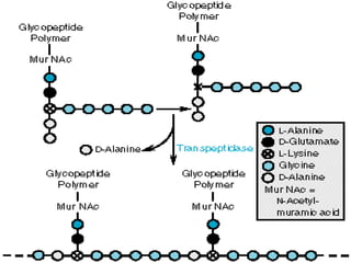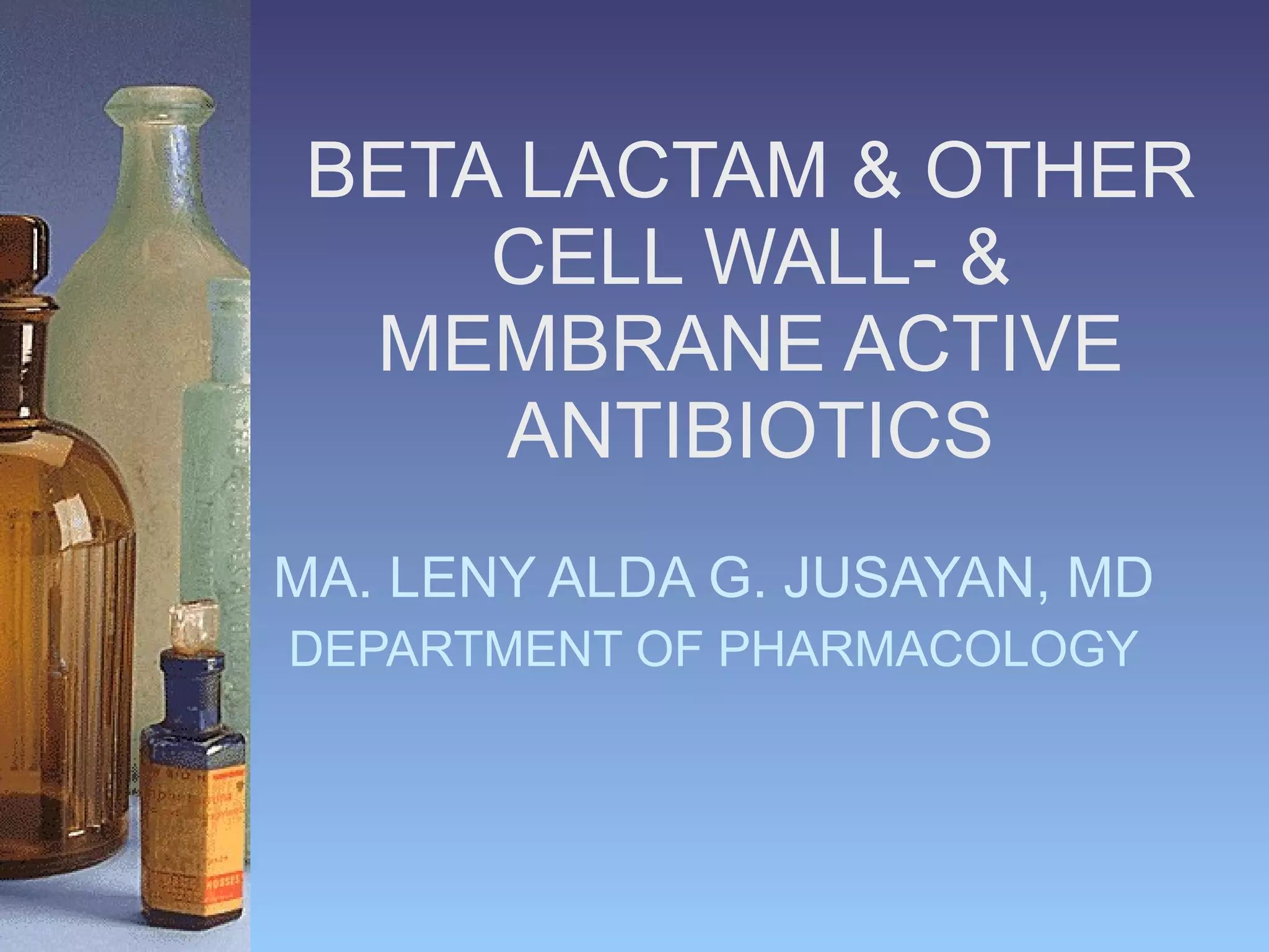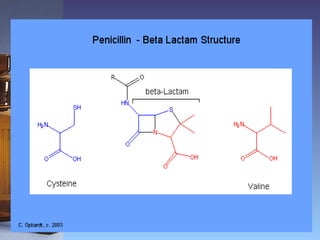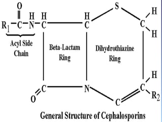 This document summarizes beta lactam antibiotics and other cell wall-active antibiotics. It discusses the history, structure, mechanisms of action, and classifications of penicillins. It provides details on specific penicillins including their spectra of activity, pharmacokinetics, dosages and adverse effects. The document covers key classes of beta lactam antibiotics including penicillins, cephalosporins, carbapenems, and other cell wall synthesis inhibitors.