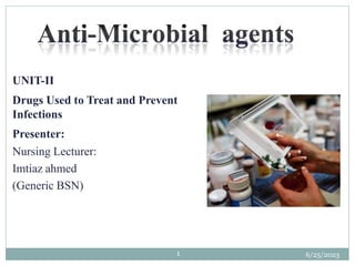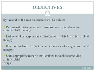 This document provides an overview of antimicrobial drugs used to treat and prevent infections. It begins with objectives of reviewing key concepts of antimicrobial therapy. It then discusses mechanisms of action for different classes of antimicrobials including why antibiotics only target bacterial cells. The remainder of the document covers specific classes of antimicrobial drugs like beta-lactams, macrolides, and vancomycin. It provides details on indications, mechanisms of action, and important nursing considerations for each drug class.