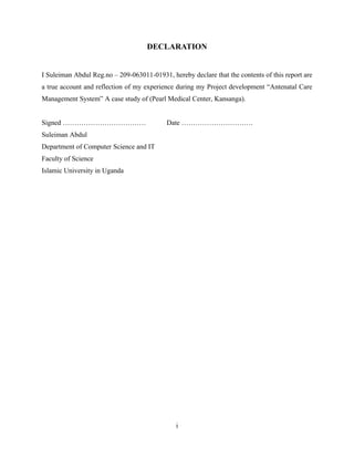 This document provides an overview of an antenatal care management system case study at Pearl Medical Center. It includes declarations, approvals, dedications, acknowledgements, and an abstract. The system was designed to manage activities during antenatal care like registration of expectant mothers, following antenatal checkups and cards, monitoring progress, managing drug availability, and balancing payments. It involved interviews, documentation review, and observations to understand requirements. The system requirements and design are also outlined.