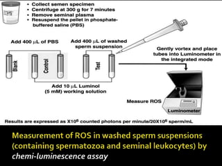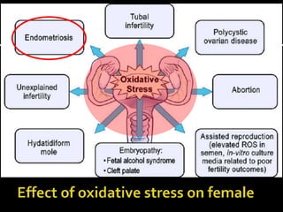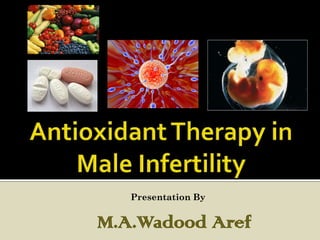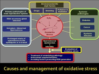 Male factor infertility accounts for 50% of infertility cases. Oxidative stress from reactive oxygen species is an important cause of male infertility. High levels of ROS can damage sperm cells through lipid peroxidation and DNA fragmentation. Antioxidant supplements like vitamins C and E, carnitine, N-acetyl cysteine, CoQ10, and zinc can help reduce oxidative stress by scavenging excess ROS in semen. This may help improve sperm parameters and treat infertility caused by oxidative stress.