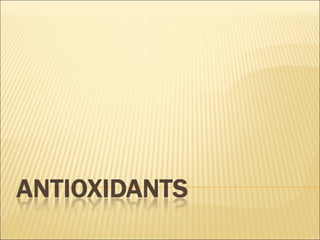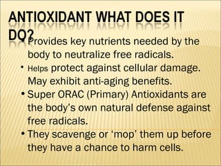 The document discusses how antioxidants like vitamins C and E, carotenoids, and enzymes like superoxide dismutase and glutathione peroxidase protect the body from free radical damage by neutralizing reactive oxygen species. It explains that oxidative stress occurs when there is an imbalance between the production of free radicals and the body's antioxidant defenses, leading to cell and tissue damage if left unchecked. Maintaining adequate intake of antioxidants from foods and proper functioning of the body's endogenous antioxidant systems is important for preventing diseases linked to oxidative stress.