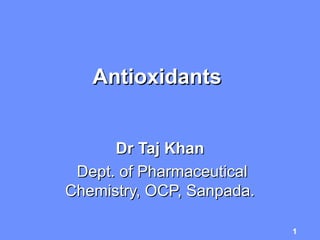 This document discusses antioxidants used in pharmaceutical preparations. It defines antioxidants as agents that inhibit oxidation and lists some common examples. The document explains that antioxidants terminate chain reactions from free radicals that can damage cells. It describes how antioxidants are added to pharmaceuticals to prevent oxidation and deterioration of active components. Some official inorganic antioxidants discussed include sodium metabisulfite, hypophosphorous acid, sodium bisulfite, sodium nitrite, and nitrogen gas. Their mechanisms and uses as antioxidants in pharmaceutical preparations are summarized.