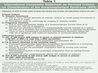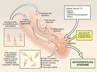 Antiphospholipid syndrome (APS) is an autoimmune disorder characterized by blood clots in arteries and veins, pregnancy complications, and the presence of antiphospholipid antibodies. The syndrome can occur alone or in association with other autoimmune diseases like lupus. Treatment involves long-term anticoagulation with blood thinners and aspirin to prevent new clots from forming. Management of pregnancy in APS patients depends on their history and involves low-dose aspirin with or without low or high dose blood thinners.