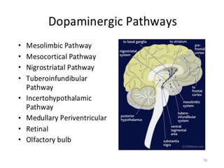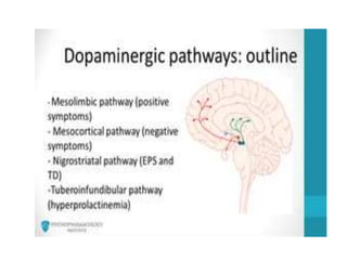 This document discusses neuropsychiatry and antipsychotic medications. It begins by outlining the four dopamine pathways relevant to antipsychotic pharmacology: mesolimbic, mesocortical, nigrostriatal, and tuberoinfundibular. It then describes each pathway's anatomy, physiology, and implications for symptoms of schizophrenia. The document also covers types of antipsychotics, their mechanisms of action, indications, and various adverse effects including weight gain, sedation, and neurological side effects. In summary, it provides an overview of the neurobiology underpinning antipsychotic treatment and the therapeutic and adverse impacts of blocking different dopamine pathways in the brain.