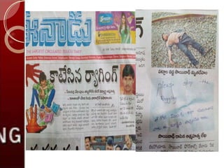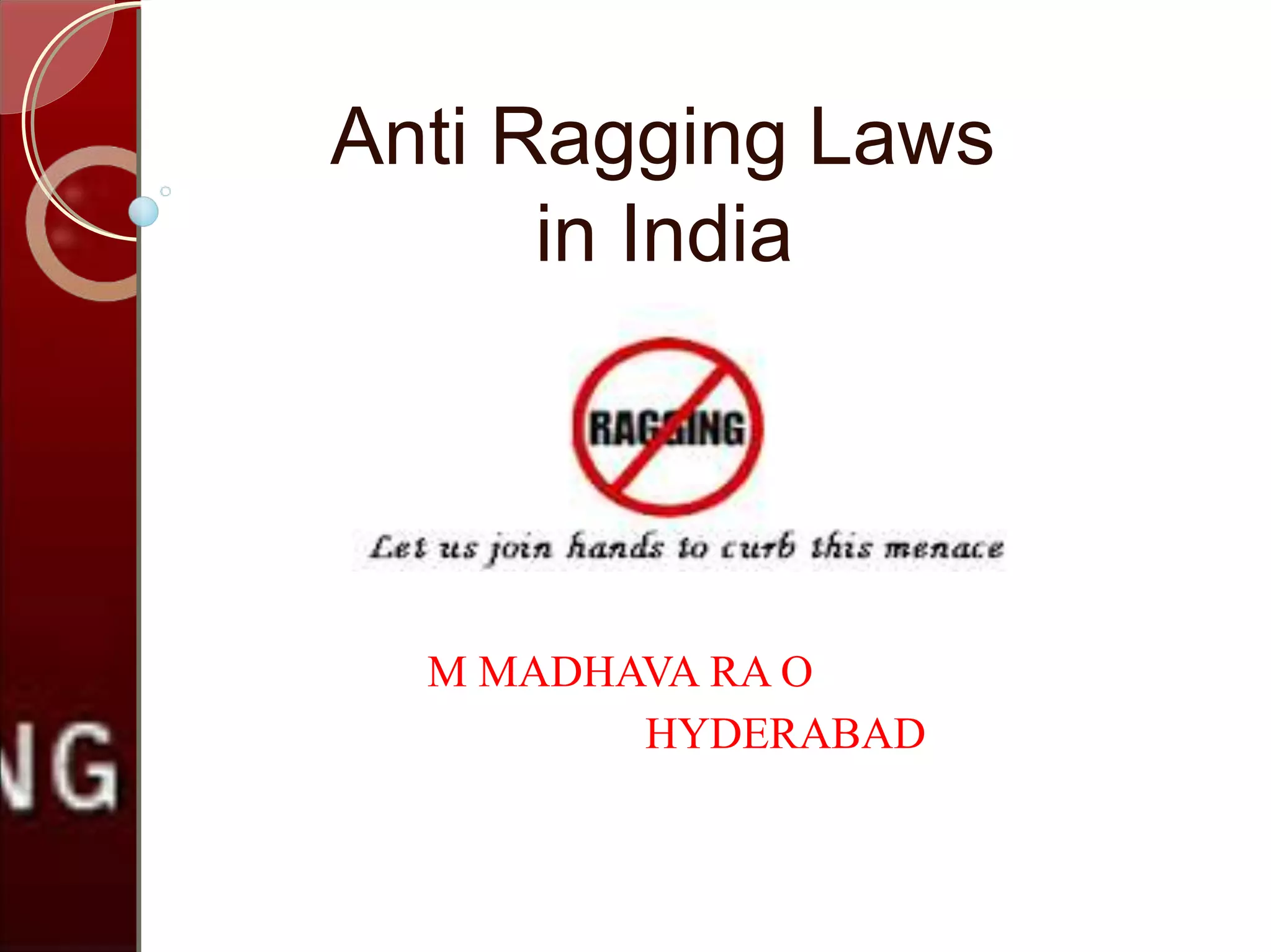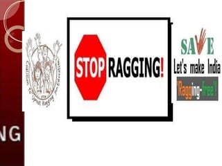 Ragging in India is legally defined as any disorderly conduct that causes annoyance, hardship, or psychological harm to students. The Supreme Court has laid out guidelines against ragging, including undertakings signed by students and parents, and procedures for addressing ragging incidents. A committee recommended ragging be treated as a human rights abuse and all stakeholders be made aware. Punishments for those engaging in ragging include suspension, withholding of benefits and results, debarring from college activities, and expulsion. The solution lies with students themselves ending this inhuman practice.