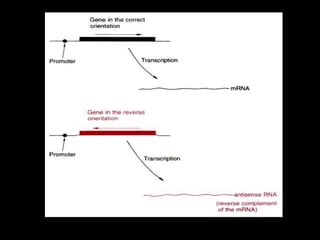 This document discusses RNA interference (RNAi) and antisense RNA technology for controlling gene expression in plants. It explains that RNAi works by introducing double-stranded RNA that is processed into siRNAs to target and degrade complementary mRNA, preventing protein production. Antisense RNA also binds to mRNA but blocks processing or translation. Both techniques allow specific genes to be silenced and have applications for improving plant traits like disease resistance, ripening time, and nutrient content. The document provides detailed explanations of the mechanisms and applications of RNAi and antisense RNA technology.