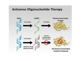 The document discusses antisense therapy as a treatment for genetic disorders, notably motor neuron diseases like Duchenne muscular dystrophy (DMD) and infections such as cytomegalovirus retinitis. Antisense oligonucleotides can inactivate specific messenger RNA to turn off disease-causing genes, with approved treatments for conditions like DMD and cytomegalovirus. It also covers the synthesis, delivery methods, and various applications of oligonucleotides in molecular biology and medicine.