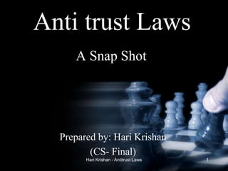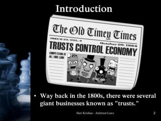The document provides an overview of antitrust laws, beginning with their historical context in the 1800s when monopolistic 'trusts' dominated sectors like railroads and steel. Key legislation like the Sherman Act, Clayton Act, and the Competition Act in India aimed to promote fair competition and prevent anti-competitive practices, with regulatory bodies such as the FTC and CCI established to enforce these laws. It details specific provisions against anti-competitive agreements, abuse of dominance, and regulation of mergers in both the U.S. and Indian contexts.