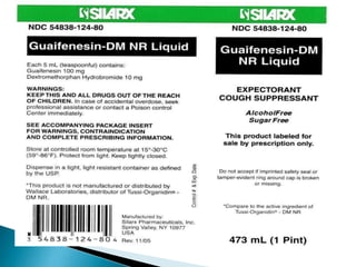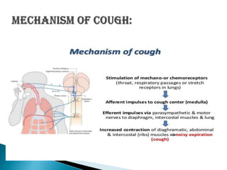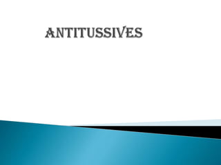 Codeine is a commonly used antitussive (cough suppressant) that works by raising the stimulus threshold of the cough center in the brain. It is effective at reducing coughs by 40-60% compared to placebos. Codeine is also a mild opioid analgesic. Other antitussives include dextromethorphan (non-opioid), expectorants like guaifenesin to loosen mucus, and mucolytics like acetylcysteine that work to liquefy mucus in the respiratory tract.