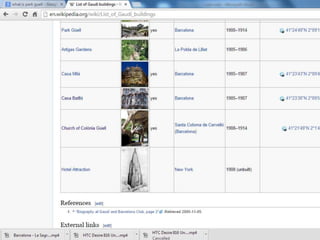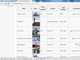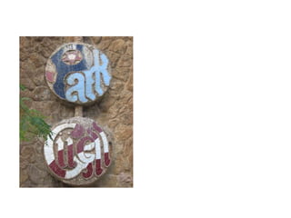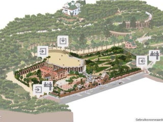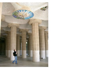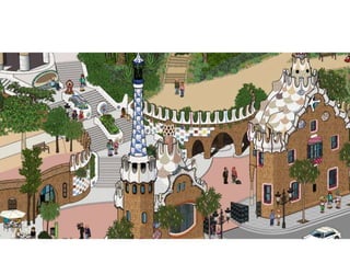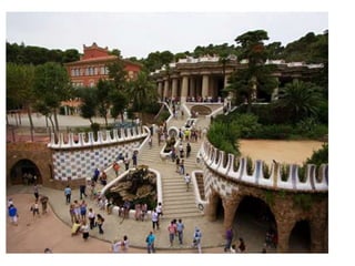 Antoni Gaudí was a Spanish Catalan architect known as the principal exponent of Catalan Modernism. He designed several notable buildings in Barcelona including Park Güell, Palacio Güell, Casa Milà, Casa Vicens, Casa Batlló, and his most famous work, the unfinished Sagrada Familia basilica. Park Güell was designed as a residential estate high above Barcelona and features architectural elements and gardens integrated into the natural landscape.
