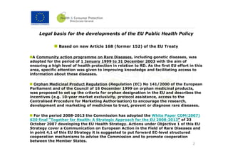 The European Union has taken several actions to address rare diseases at the EU level. This includes establishing an Orphan Medicinal Product Regulation to incentivize research and development of treatments for rare diseases. The EU has also adopted the Second EU Health Programme for 2008-2013, which prioritizes rare diseases. More recently, the EU issued a Commission Communication and Council Recommendation on rare diseases calling on member states to develop national plans or strategies for rare diseases by 2013.