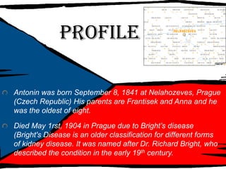 Antonin Dvorak was a Czech composer who lived from 1841 to 1904. He was one of the most influential composers of the late Romantic era, incorporating folk influences and new forms into his compositions. Some of his most famous works include his Ninth Symphony, known as the "New World" Symphony, as well as his Cello Concerto and String Serenade. Dvorak had a successful career as a composer and teacher, including a stint in America where he directed the National Conservatory and sought to discover American folk music. He left a significant body of orchestral, chamber, choral, and operatic works before his death.