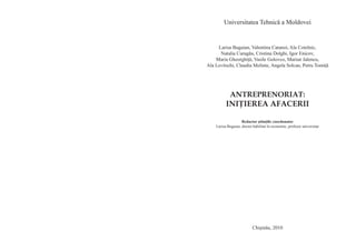Documentul reprezintă o lucrare coordonată de Larisa Bugaian și abordează tema antreprenoriatului, incluzând concepte, tipuri de afaceri și modalități de lansare a acestora. Este structurat pe capitole care discută de la ideea de afaceri, aspectele legale, marketing, până la resursele umane necesare pentru inițierea și dezvoltarea unei afaceri. Lucrarea este recomandată pentru editare de Senatul Universității Tehnice a Moldovei și include contribuții semnificative din partea mai multor autori expertiza lor în domeniu.
