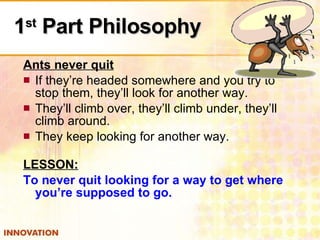 The ant philosophy document outlines lessons that can be learned from observing ants. It discusses four key points: 1) Ants never give up and will find alternative paths to reach their destination, teaching us to never quit. 2) Ants gather food in summer for winter, teaching us to think ahead and be realistic. 3) Ants stay positive during winter by remembering it will end soon, teaching us to remain optimistic. 4) Ants gather as much food as possible for winter, teaching us to do all we can. The overall message is about perseverance, preparedness, positivity, and hard work.