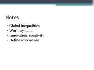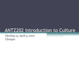 This document discusses various types and causes of cultural change from multiple perspectives in anthropology. It covers broad societal changes like industrialization and individualism. It also examines changes from internal innovation as well as external contacts through trade, war, colonialism, and globalization. The document also outlines shifts in ethnographic approaches over time from early realism to interpretive and problem-oriented frameworks that consider ethnographies as products within broader global and identity contexts.