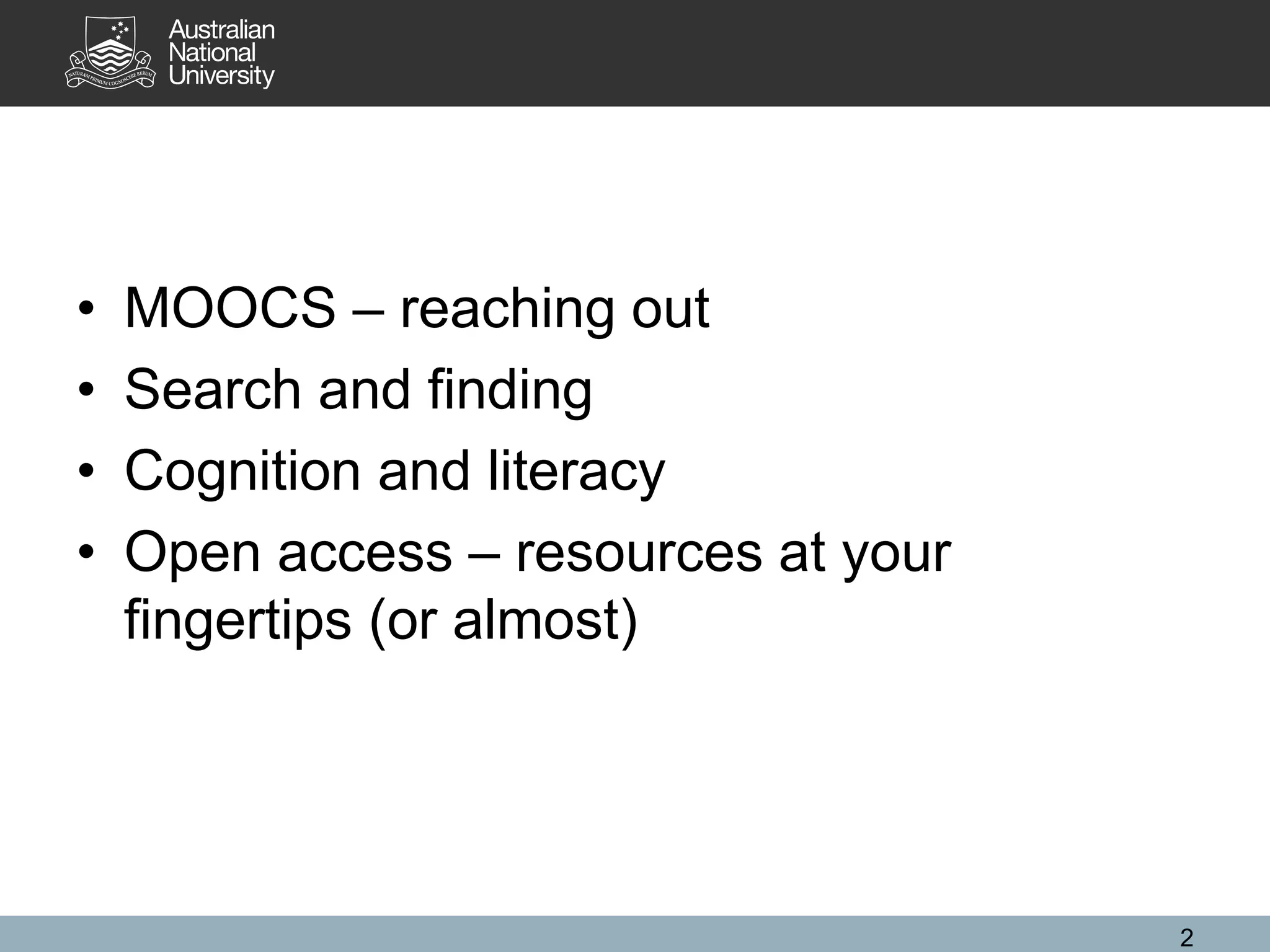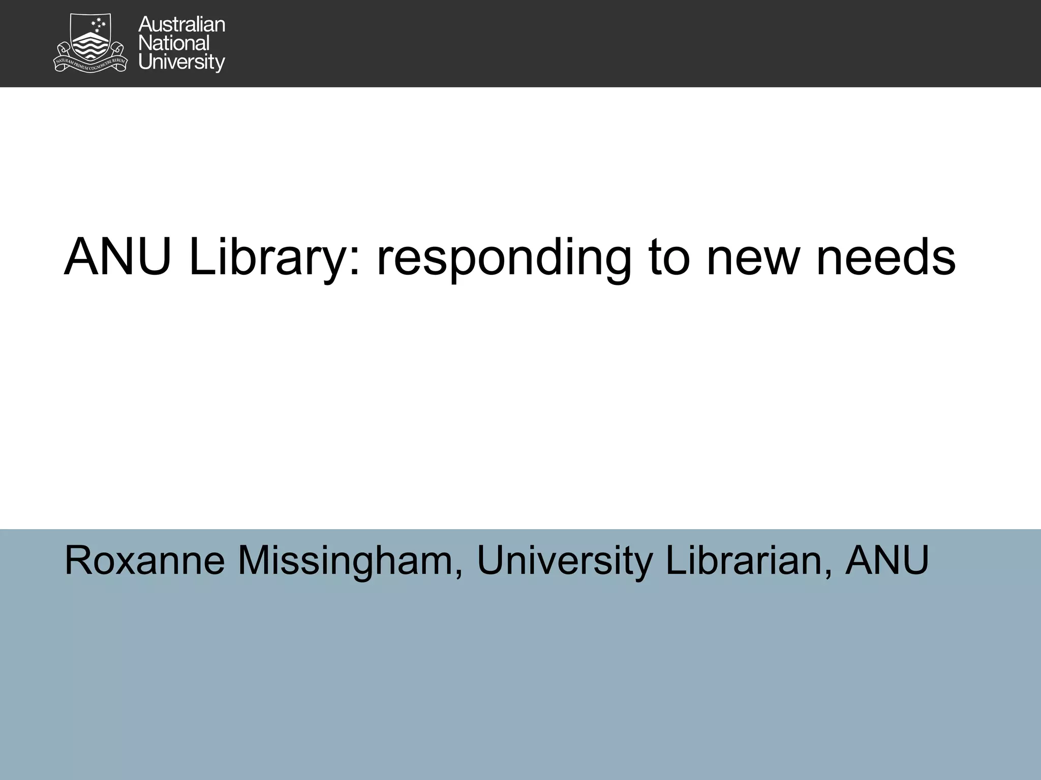 The document discusses how ANU Library is responding to changing needs through initiatives like MOOCs, improving search and finding resources, and supporting open access. It covers topics like theories of cognition and literacy, analyzing usage of the library catalogue and e-resources, and redesigning services to incorporate research on cognition and learning. The library aims to continue adapting to new developments in education through collaboration and exploring initiatives such as digitization and scholarly publishing.