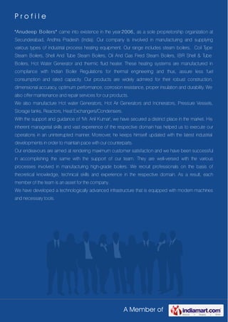 Anudeep Boilers, established in 2006 in Secunderabad, India, specializes in manufacturing industrial heating equipment, including steam boilers, thermic fluid heaters, and pressure vessels. The company emphasizes quality and compliance with Indian boiler regulations while also offering maintenance services. Led by Mr. Anil Kumar, Anudeep Boilers aims for maximum customer satisfaction through a skilled team and advanced infrastructure.