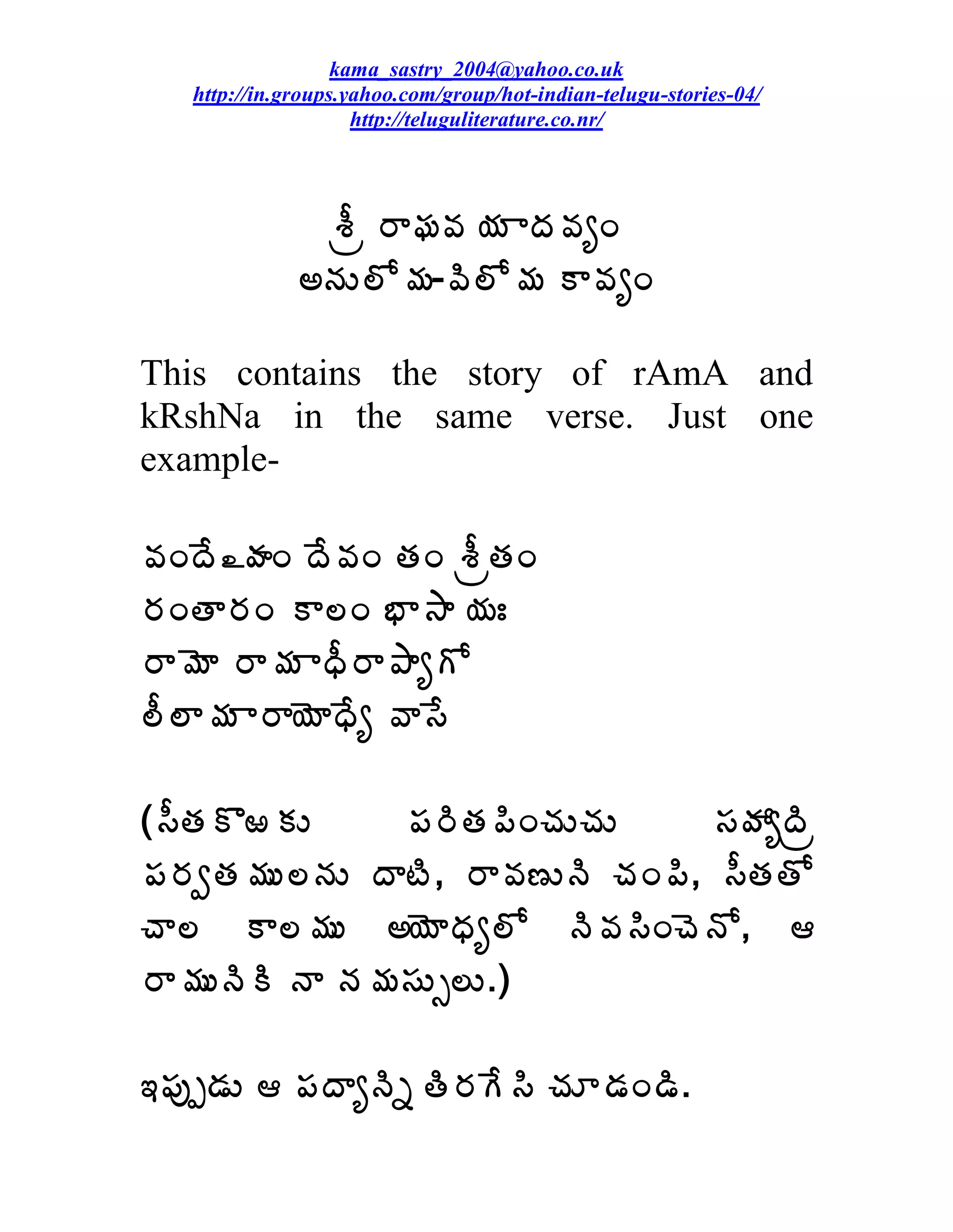 This document contains two verses comparing the stories of Rama and Krishna. The first verse describes Rama leaving for the forest with Sita and Lakshmana, parallel to Krishna herding cows. The second verse tells of Rama defeating Ravana and rescuing Sita, similar to Krishna's childhood feats. The document provides contact information for a Telugu literature website and discussion group.