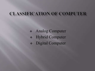 - Other computer types discussed are mainframes for CPU/I/O intensive jobs, mini computers for real-time multi-user apps, microcomputers for simple tasks, and supercomputers for large data and intensive computing.