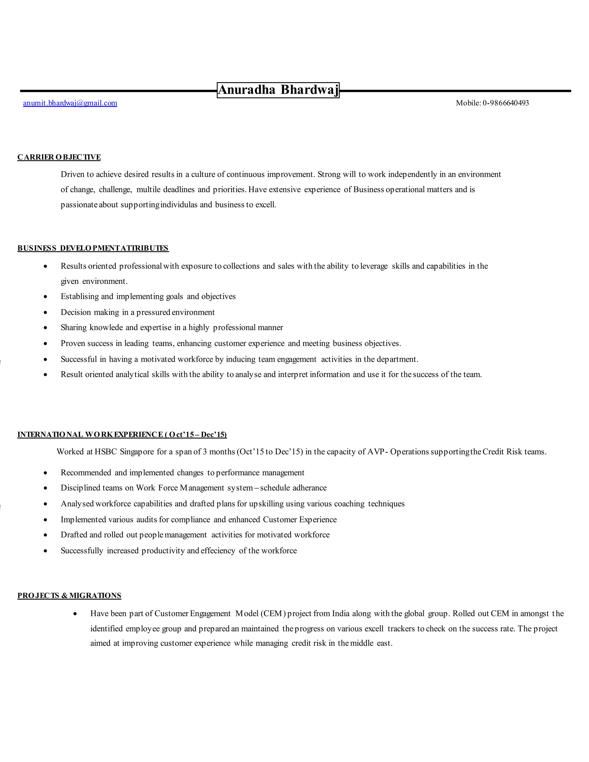 Anuradha Bhardwaj is seeking a career opportunity where she can utilize her extensive experience in business operations and passion for supporting individuals and businesses to excel. She has over 15 years of experience in collections, sales, operations, and people management. Bhardwaj is results-oriented and has a proven track record of achieving targets and motivating teams. She is proficient in English and has worked internationally in Singapore for 3 months in 2015. Bhardwaj holds a Post Graduate Diploma in Business Management and Bachelor's degree in Commerce.