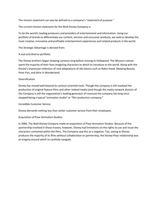 The Walt Disney Company's mission is to be the world's leading producer and provider of entertainment and information. They seek to create the most creative and profitable entertainment experiences using their portfolio of brands. Disney has built a strategic advantage through their vast portfolio that includes classic characters, diversification beyond animation into live action films and media networks, and a reputation for incredible customer service. In 2006, Disney acquired Pixar Animation Studios to gain full rights to popular characters like Toy Story.