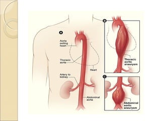 An aneurysm is a bulge or swelling in an artery caused by weakening of the arterial wall. There are several types including abdominal aortic aneurysms, thoracic aortic aneurysms, and cerebral/brain aneurysms. Risk factors include age, smoking, hypertension, and family history. Symptoms depend on the type but can include pain, nausea, vomiting, and vision changes. Diagnostic tests include imaging like CT scans. Treatment involves medication, surgery such as open repair or endovascular repair, and lifestyle changes to control risk factors. Post-operative care focuses on monitoring for complications like infection, bleeding, and tissue perfusion issues.