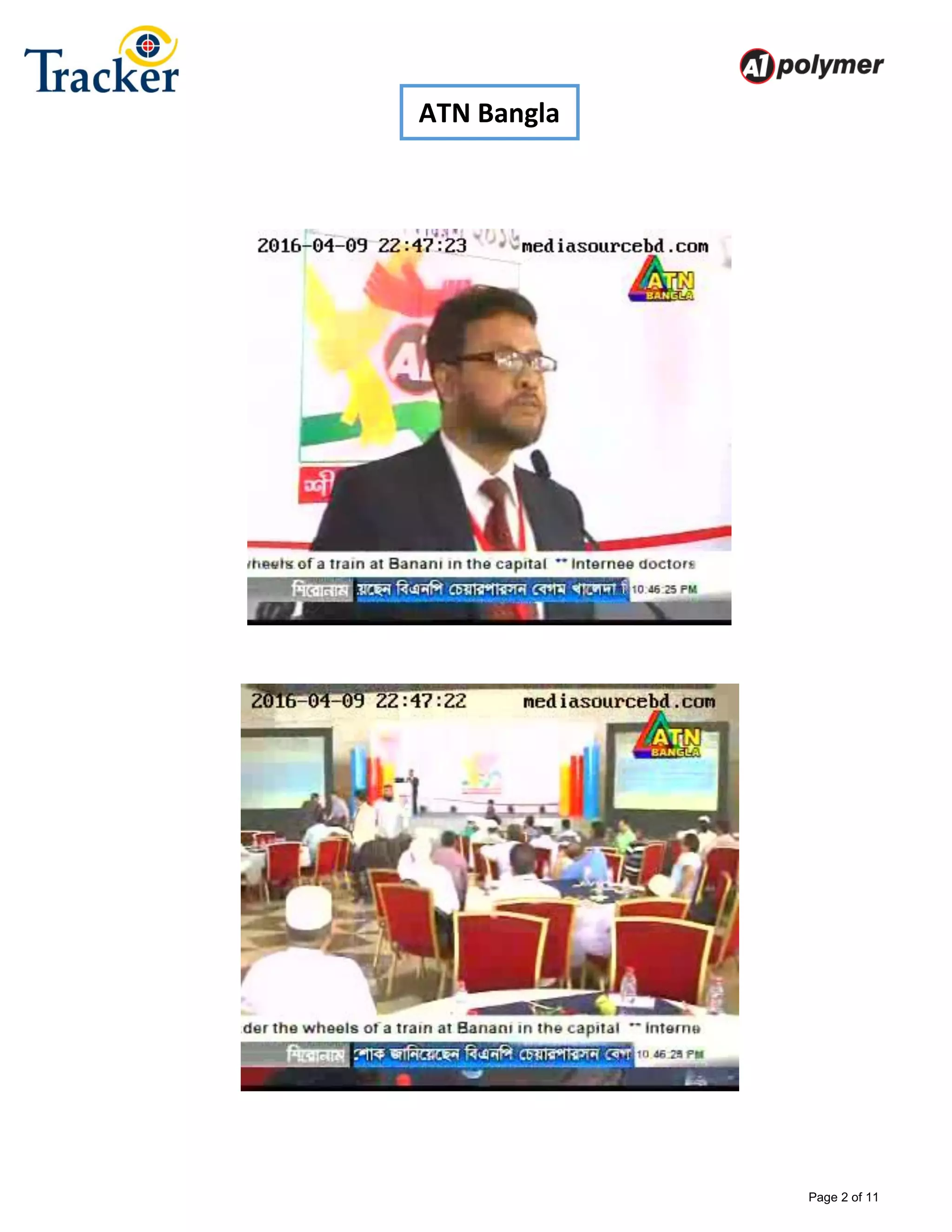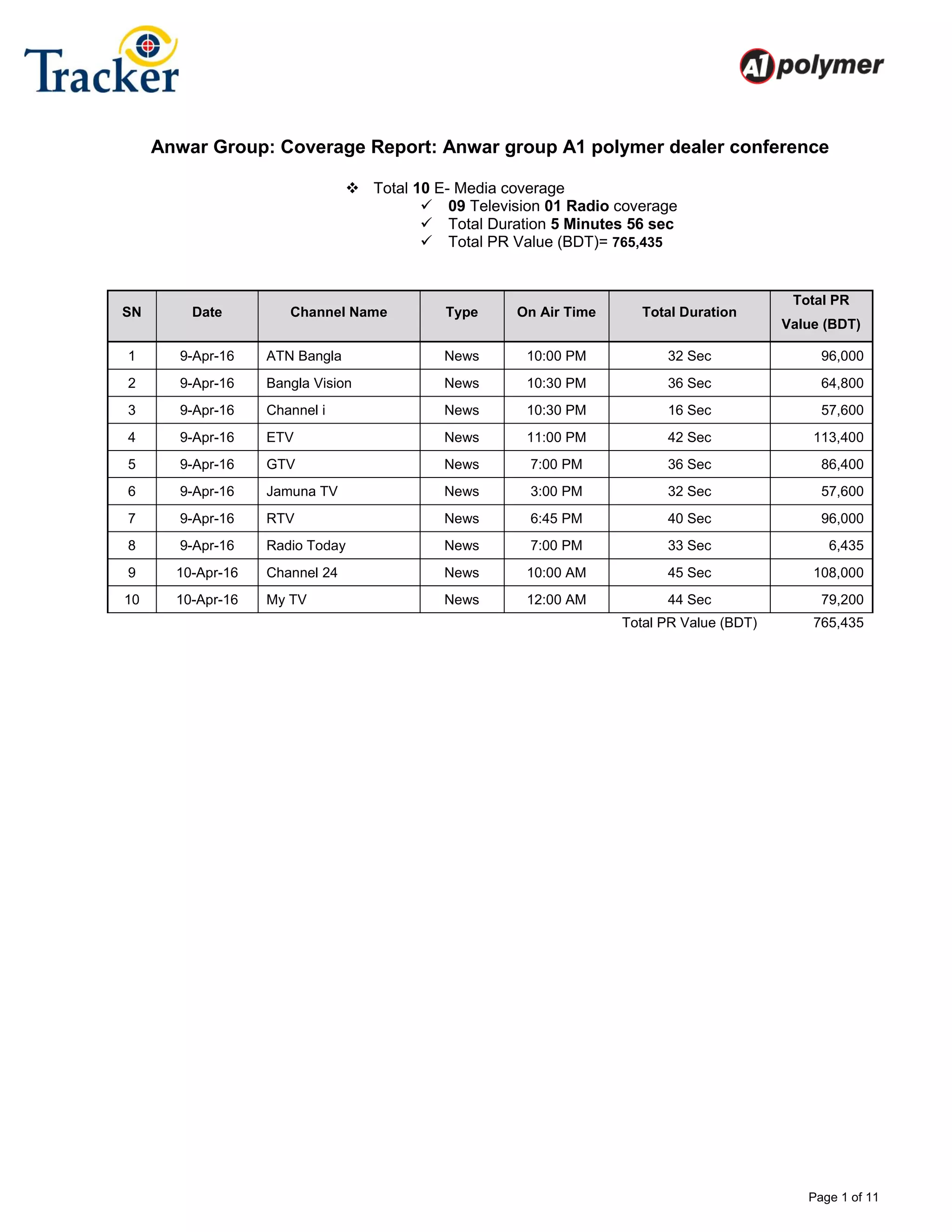 The document is an 11-page coverage report from Anwar Group about media coverage of their polymer dealer conference. It summarizes there was a total of 10 electronic media coverages, including 9 TV and 1 radio coverage, with a total duration of 5 minutes and 56 seconds. The total public relations value of the coverage in Bangladesh Taka (BDT) currency was 765,435. It then provides details of each media coverage by channel, date, time, duration, and individual public relations value.